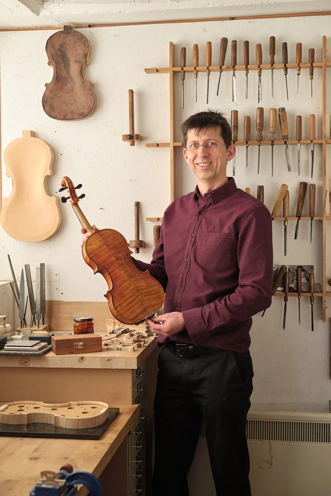 William started at the Newark Violin Making School in 1979 and upon graduation in 1982 went to work in the restoration workshop of Geigenbau Machold in Bremen. After three years there, seeing many classical Italian instruments, he set up on his own in York, mixing repair work and making. Since 1996 he has lived in Shropshire, devoting his time to making new instruments.